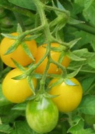 - ‘Green Grap’: les nombreux petits fruits de 20 grammes environ, sont de forme globuleuse, légèrement allongée§. L’épiderme est vert jaunâtre, plus intense au niveau du pédoncule. La chair est juteuse et fruitée, sucrée et acide à la fois. Cette tomate apéritif s’utilise aussi pour confectionner de délicieuse confitures.